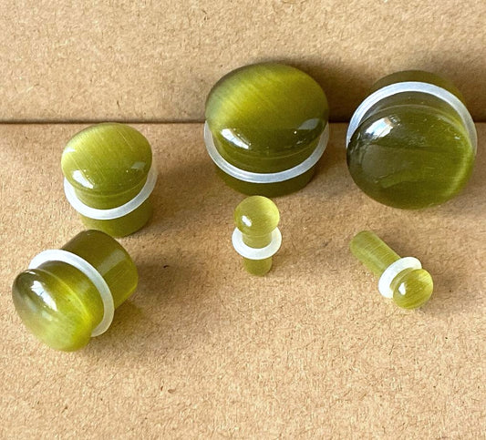 PAIR Peridot Green Cat Eye Stone Plugs Single Flare Tunnels Earlets Gauges
