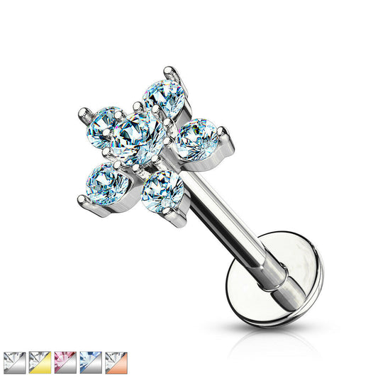 1pc Five CZ Gem Flowers 16g Labret Internally Threaded Steel Monroe Tragus Helix