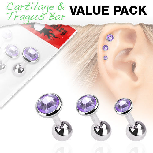 3pc Value Pack Gem Tragus Cartilage Ring 16g 1/4" - Choose Color
