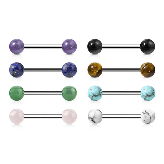 PAIR Natural Stone Nipple or Tongue Rings 14g Barbells 316L Steel Body Jewelry - Only Available In Black Agate