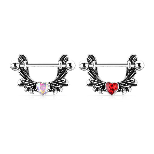 PAIR Crystal Heart Angel Wings Nipple Rings Shields 14g 14 gauge Body Jewelry