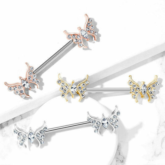 PAIR CZ Gem Paved Butterfly Nipple Rings Shields Steel Barbells
