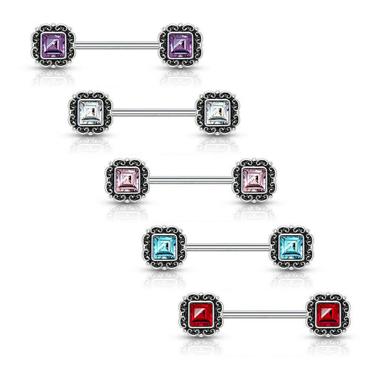 PAIR Antique Silver Filigree Square CZ Gem Nipple Rings Shields Steel Barbells
