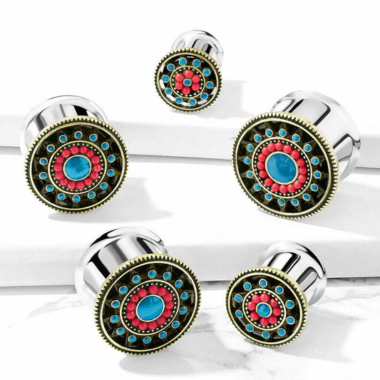 PAIR Turquoise & Enamel Beads Aztec Tribal Sun Double Flare Tunnel Plugs Gauges - Only 16mm Left In Stock