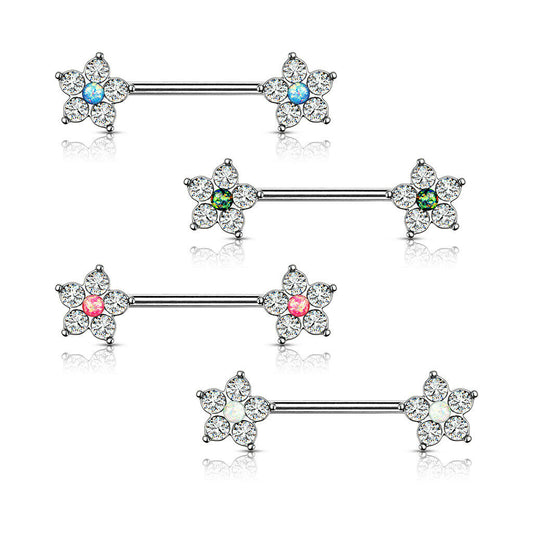 PAIR CZ Gem Flower w/ Opal Glitter Center Nipple Rings Shields Steel Barbells