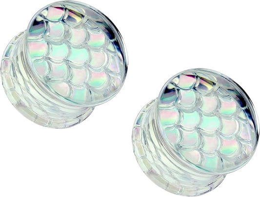 PAIR Holographic Dragon / Fish Scale Design Pyrex Glass Plugs Gauge Body Jewelry