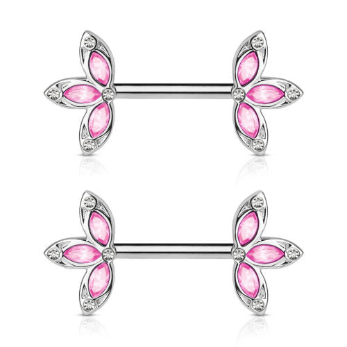 PAIR Crystal Set Three Petal Flower Ends Nipple Rings Shields