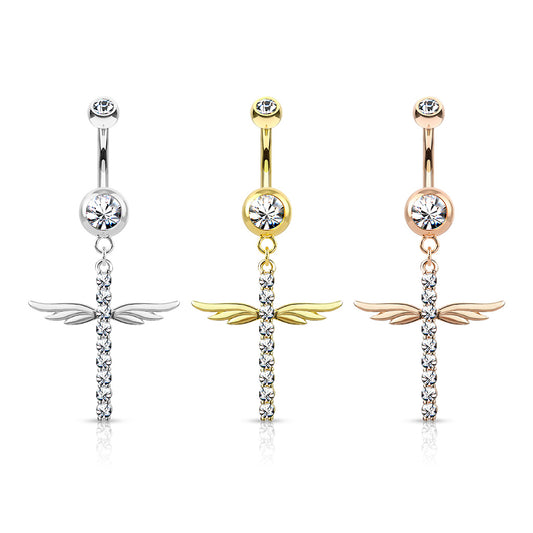 1pc CZ Gem Winged Cross Belly Button Ring Pierced Navel Gold Plated Wings Naval