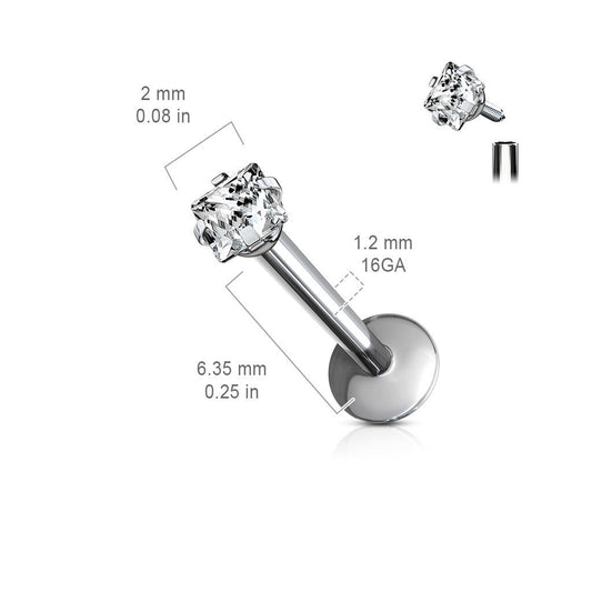 1pc Internally Threaded Solid Titanium Square Gem Labret, Monroe Stud Lip Ring