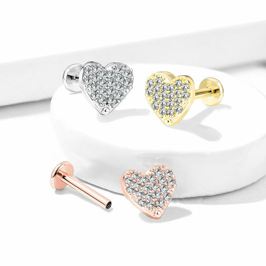 1pc CZ Paved Heart 16g Labret Internally Threaded Steel Monroe Tragus Helix