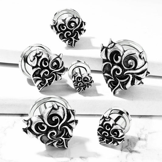 PAIR Antique Silver Devil Heart Tunnels Surgical Steel Plugs Earlets Gauges