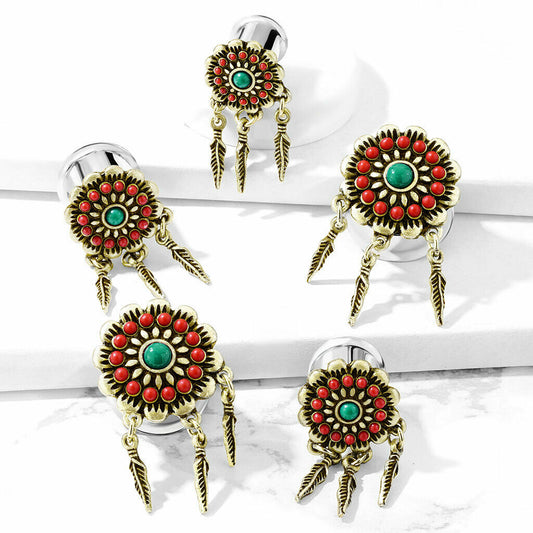PAIR Red & Turquoise Flower w/ Feather Dangles Double Flare Tunnel Plugs Gauges