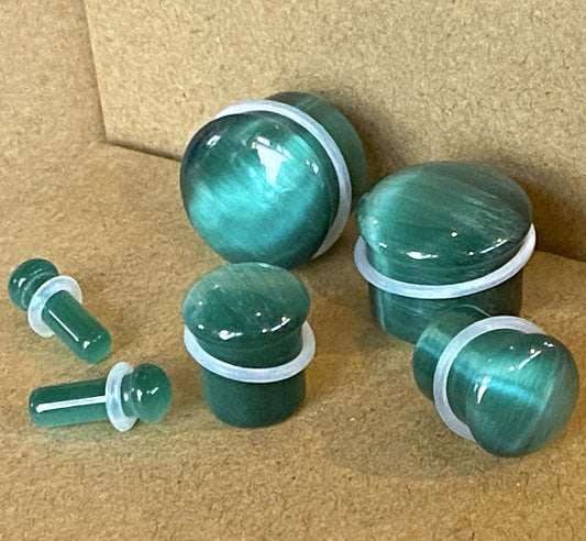 PAIR Teal Cat Eye Stone Plugs Single Flare Tunnels Earlets Gauges Body Jewelry