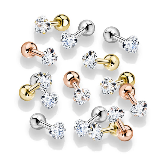 3pcs Prong Set Heart Gem Stud Tragus Rings 16g Cartilage Barbells Wholesale Lot