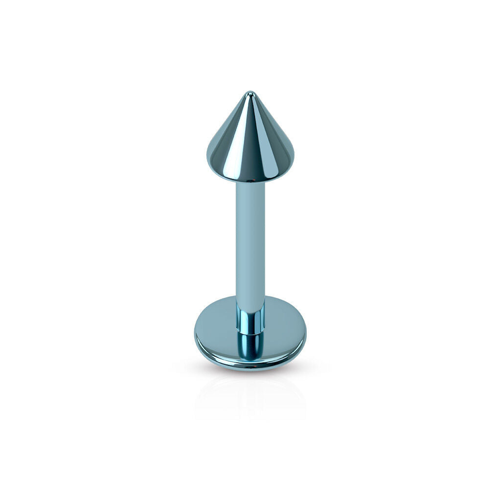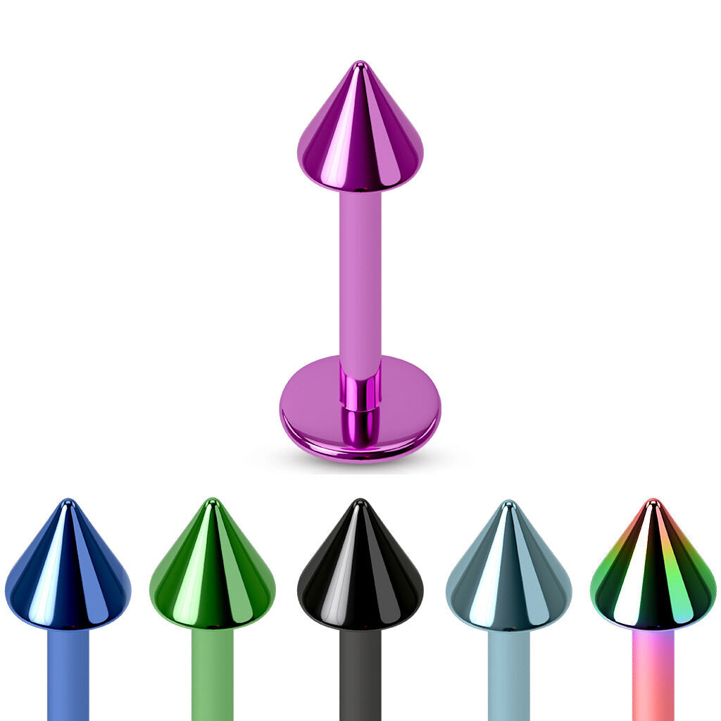 One Externally Threaded Titanium Ion Plated Spike Labret Stud - select desired color, gauge and wearable length from the drop down menus