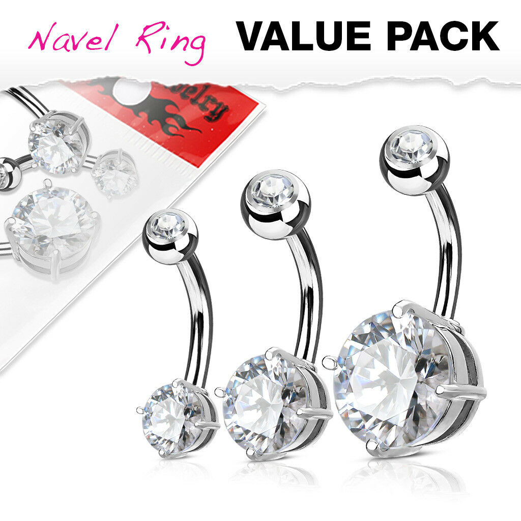 3pc Value Pack 5mm, 7mm, 10mm Prong Set Round CZ Gem Belly Rings Navel Naval
