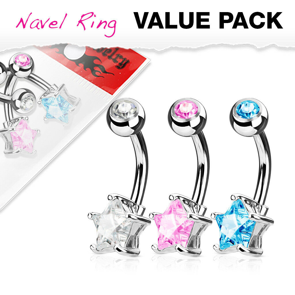 3pc Value Pack Star Prong Set CZ Gem Surgical Steel Belly Rings Navel Naval
