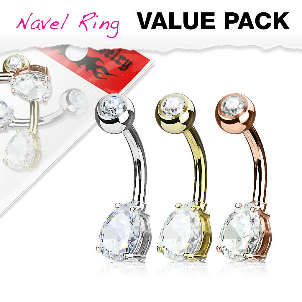 3pc Value Pack Tear Drop Prong Set CZ Gem Gold Plated Belly Rings Navel Naval