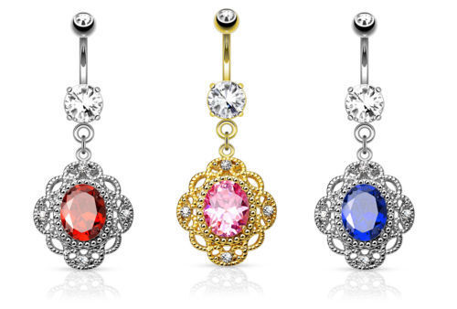 1pc Oval CZ Centered Tribal Floral Design Dangle Pierced Belly Navel Ring