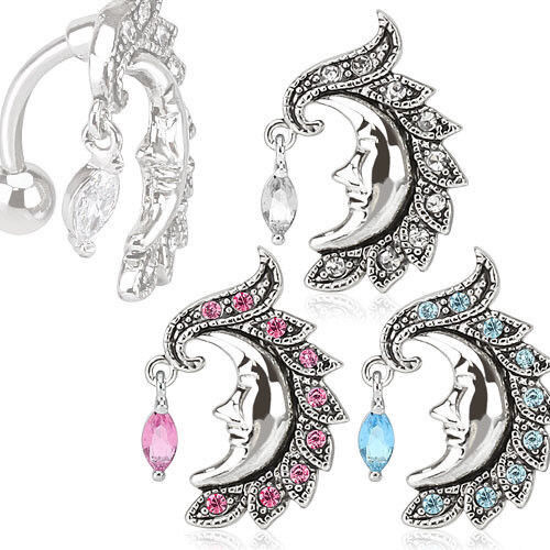 Reverse Style Crescent Moon Face Belly Ring w/ CZ Marquise Cut Dangle - Select color from drop down menu above