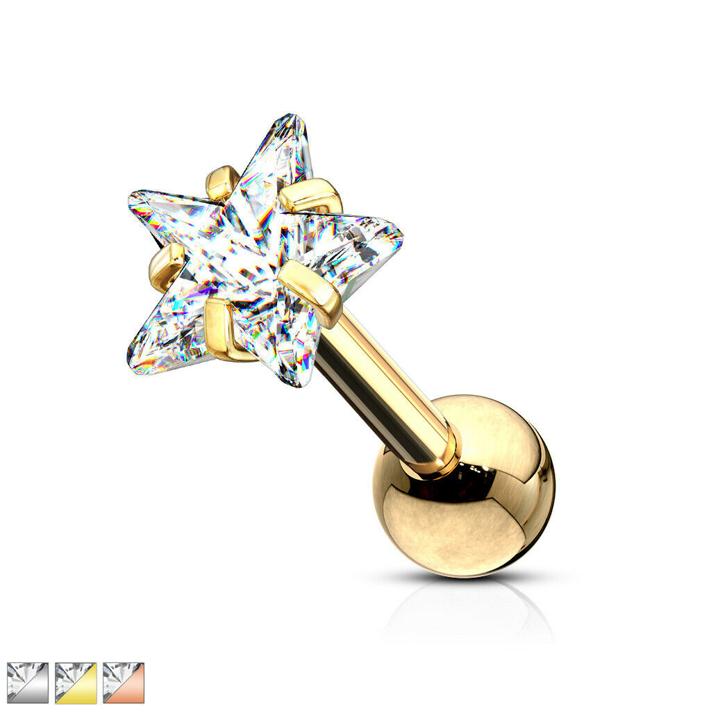 1pc Star CZ Gem Ion Plated Tragus Stud Helix Cartilage Ring Earring 1/4" 16g
