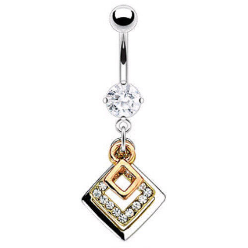Triple Tone Square Dangle Paved with CZ Clear Gems Belly Ring