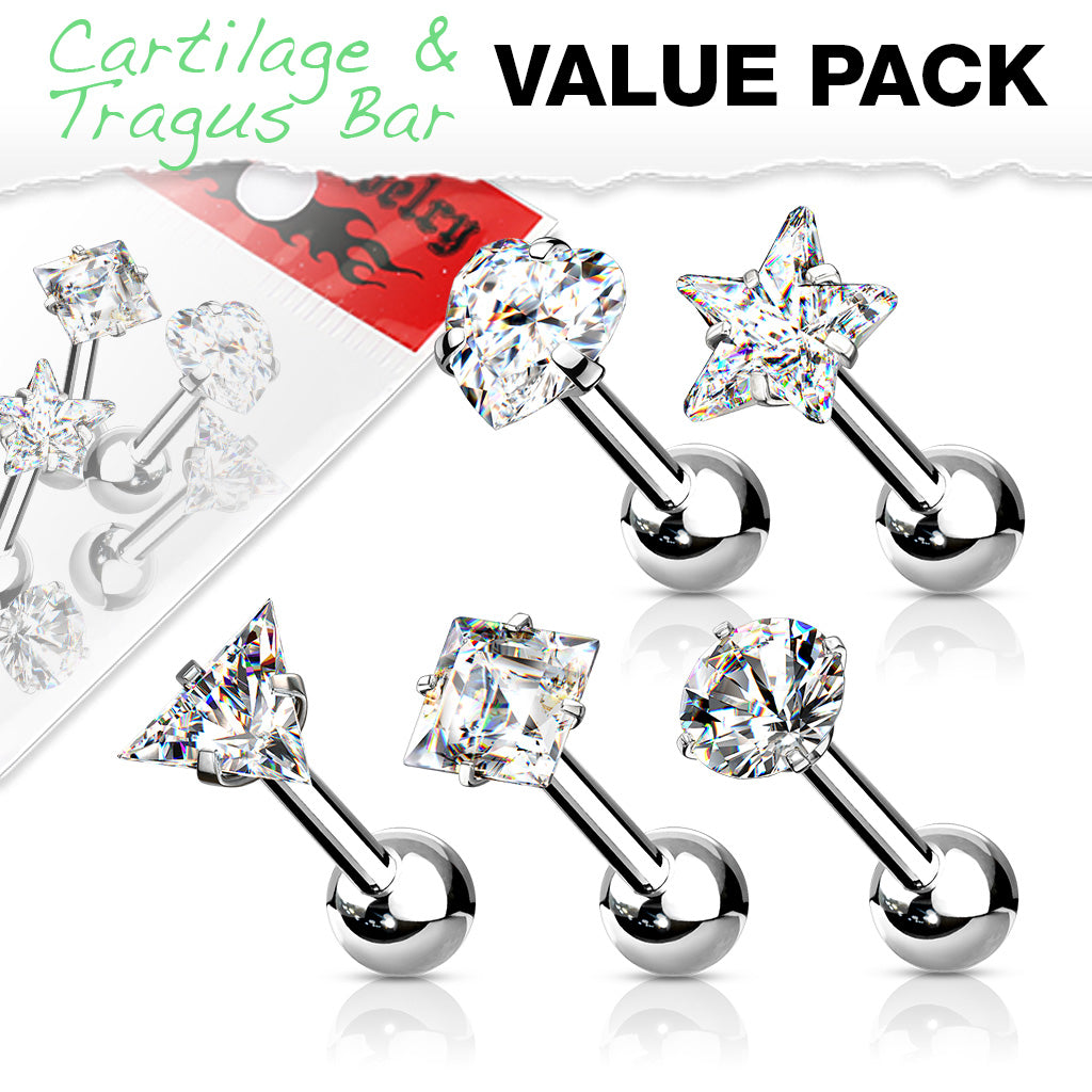 5pc CZ Gem Shapes Tragus Rings Value Pack Cartilage Barbells Helix 16g Piercing