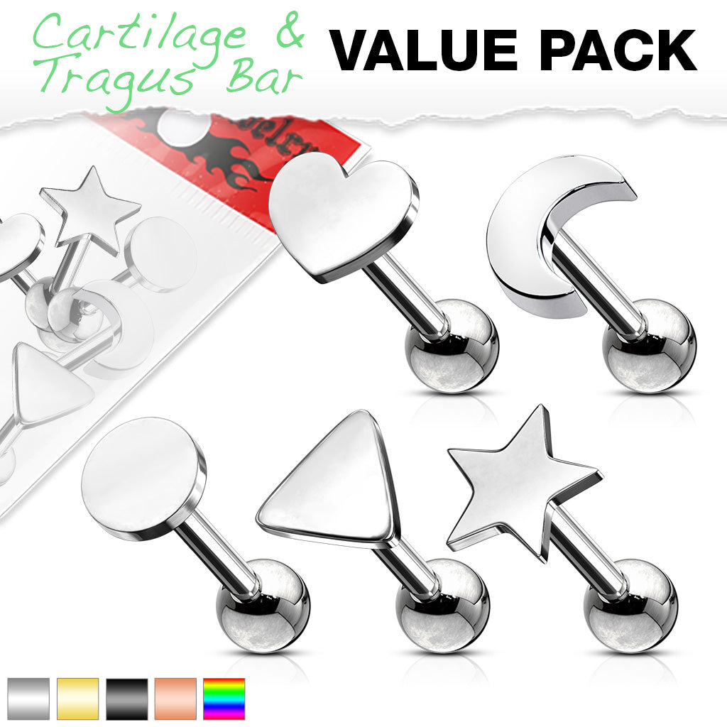 5pcs Shapes Tragus Rings Value Pack Cartilage Barbells Helix 16g Moon Star Heart