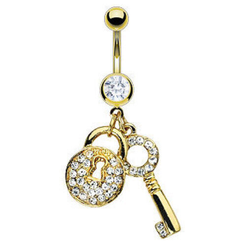 Gold Lock & Key CZ CLEAR Gem Belly Ring Navel