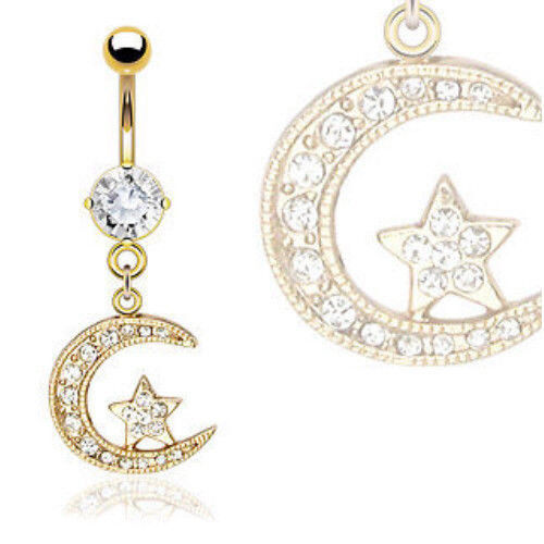 Gold Plated Moon & Star Paved with CZ Clear Dangle Gem Belly Ring