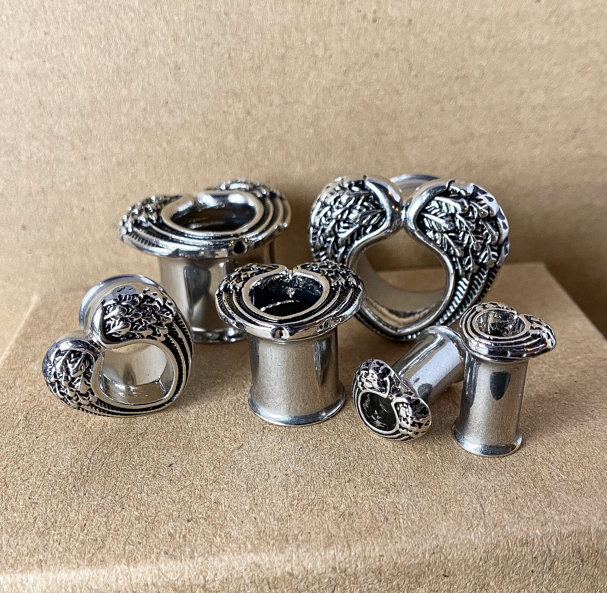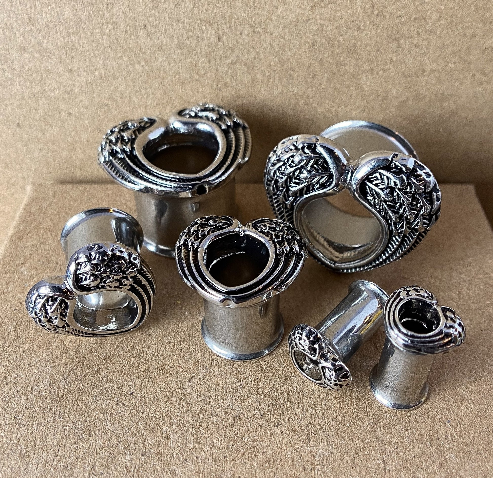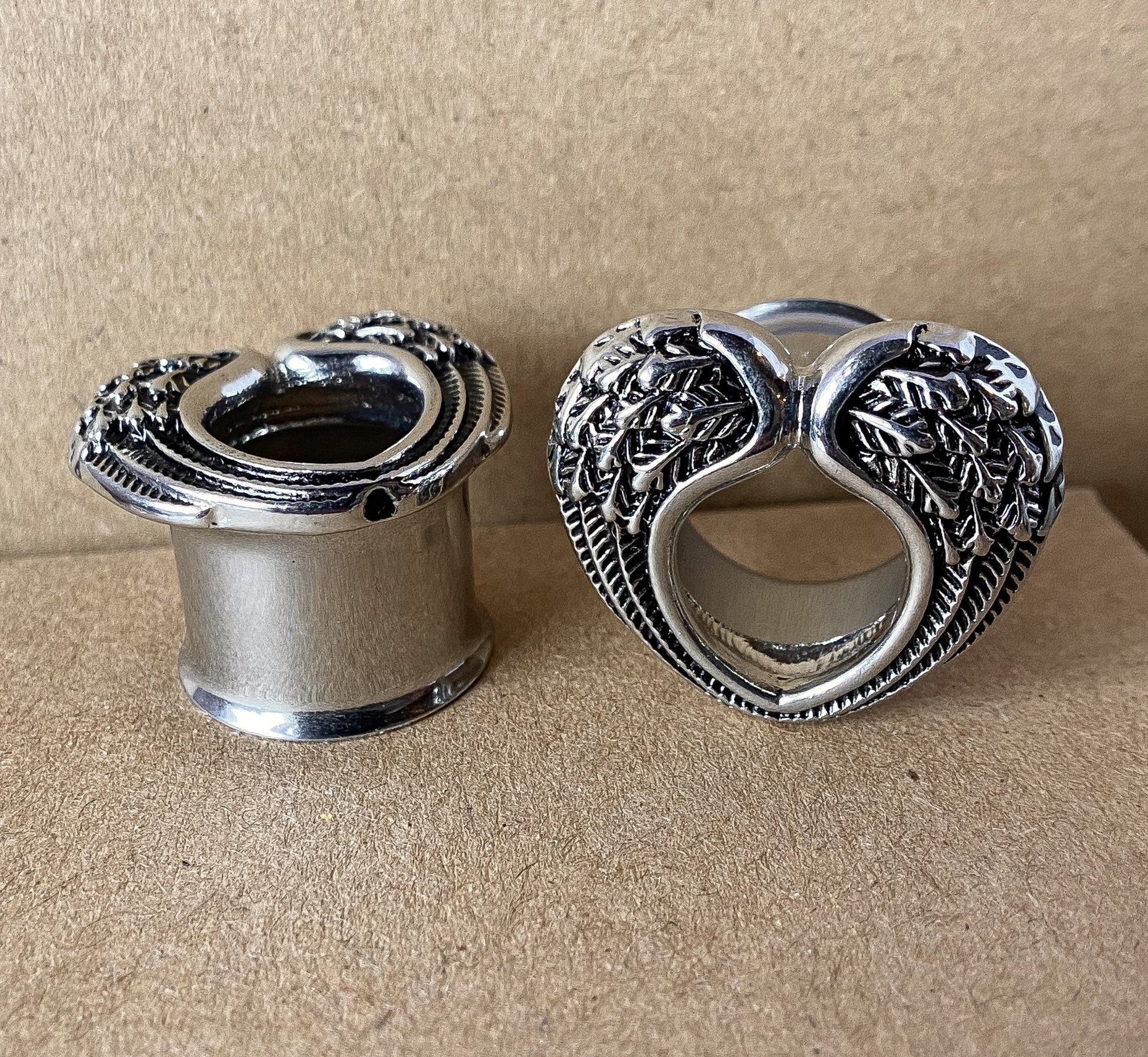 Angel Wings Heart Shaped Double Flare Tunnels by-the-pair (ordering a quantity of one gets you a pair)
