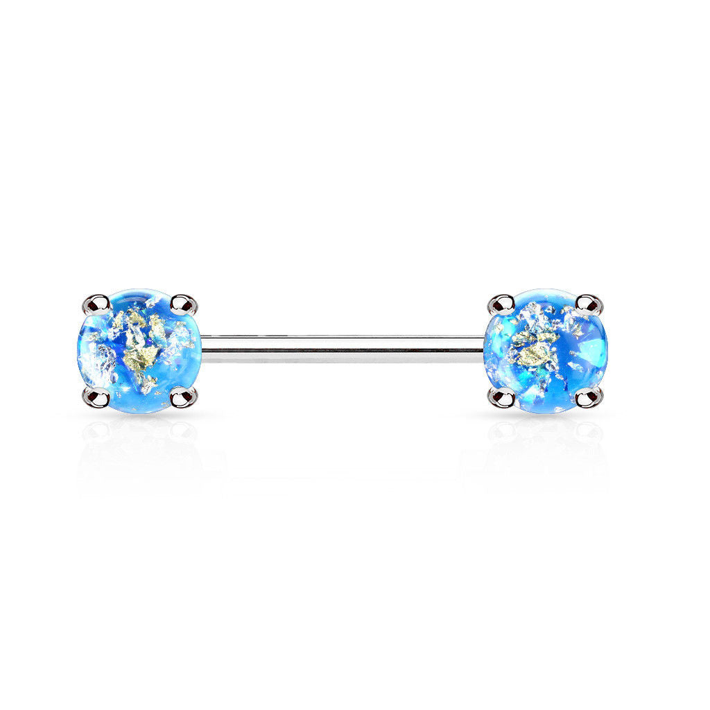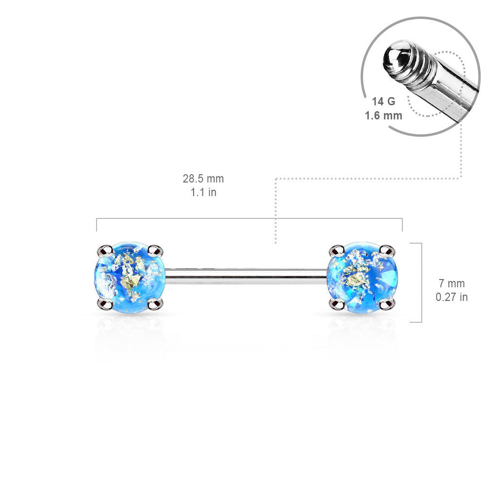 14g 316L surgical steel bar, rhodium plated brass settings, synthetic opal (resin)