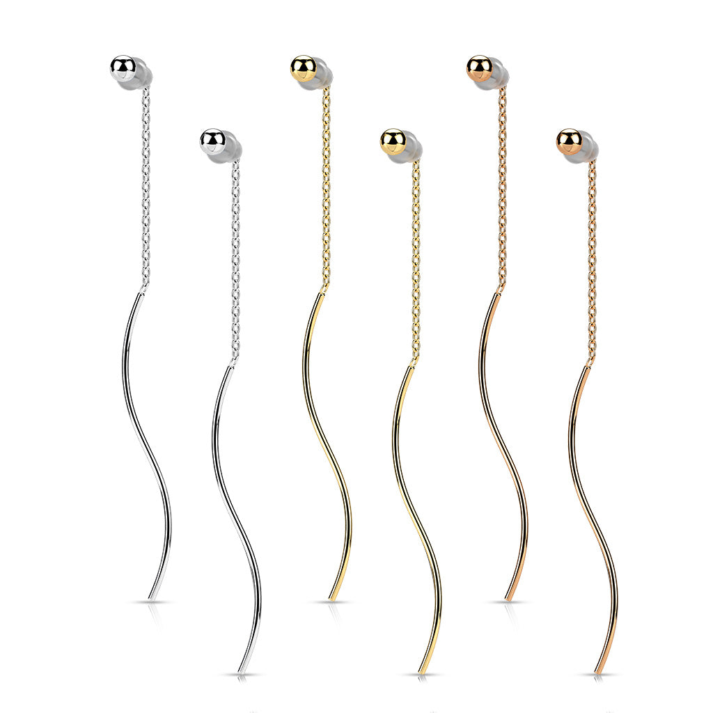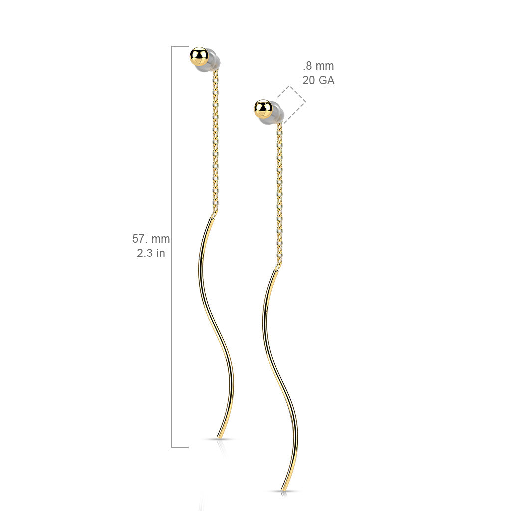 PAIR of Surgical Steel Ball and Wave Bar Dangle Threader Earrings Chain 20g