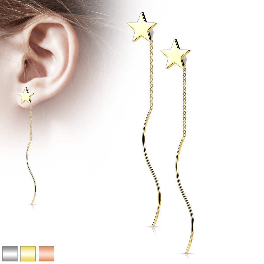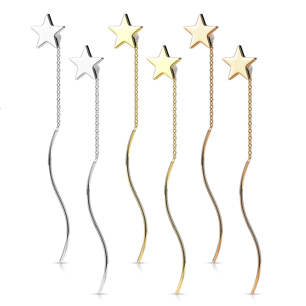 PAIR of Surgical Steel Star and Wave Bar Dangle Threader Earrings Chain 20g