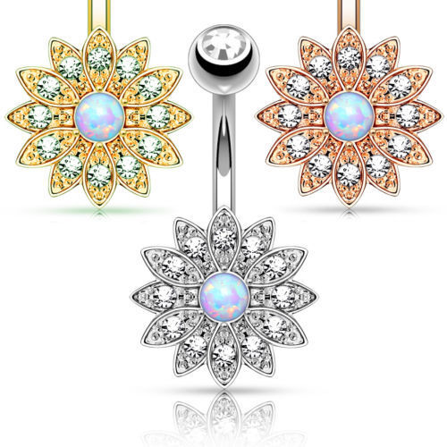 Small Flower w/ Opal Center Crystal Paved Petals Belly Button Ring Pierced Navel