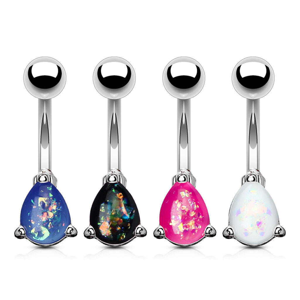 Solitaire Tear Drop Opal Glitter Gem Belly Ring 316L Surgical Steel Navel Naval
