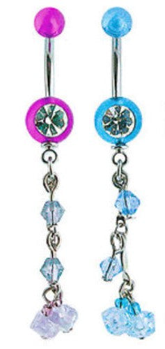 UV Belly Ring with CZ Gem, Bead & Dice Dangles - Select color from menu